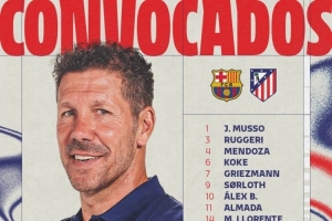 体育资讯4月7日讯 北京时间4月9日凌晨3点,欧冠1/4决赛首回合马竞将客战巴萨,马竞公布了此役球队大名单。