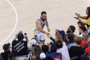 库里绝命三分后倒在观众席,被一名快船球迷推开,但这名脸色铁青的球迷最后虽然没看库里,但还是和库里碰了拳,给予了瑞思拜。