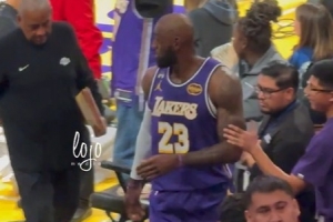 GIF-詹姆斯中场退场时被球迷摸了一把 他很生气&并告诉了现场安保