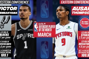 月最佳防守球员:西部文班亚马场均3.7帽 东部奥萨尔场均2.5断